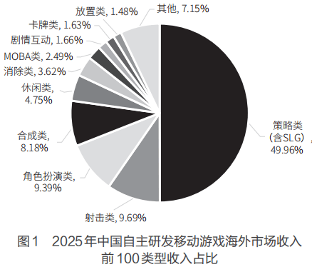在中国自主研发移动游戏海外市场收入前100名之中,策略类(含SLG)游戏占比49.96%,位居首位,近4年来,始终是自研移动游戏海外营收的最主要类型,2025年占比相对2024年的41.38%有显著上升。其次是射击类游戏和角色扮演类游戏,分别占比9.69%和9.39%,相较二者去年的收入占比(分别为10.40%和10.37%)有所下降。如图1所示。