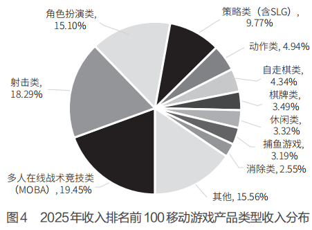 2025年,在收入排名前100的移动游戏产品中,多人在线战术竞技类(MOBA)游戏以19.45%的收入占比列首位,较去年有所增加;射击类游戏次之,占比为18.29%,同比增长明显;角色扮演类游戏位居第3,占比为15.1%。三者合计占总收入的52.84%。几款头部策略游戏的出色市场表现,带动策略游戏收入占比由2024年的6.92%涨为9.77%;动作类游戏收入占比则由2024年的9.98%下降至4.94%。如图4所示。
