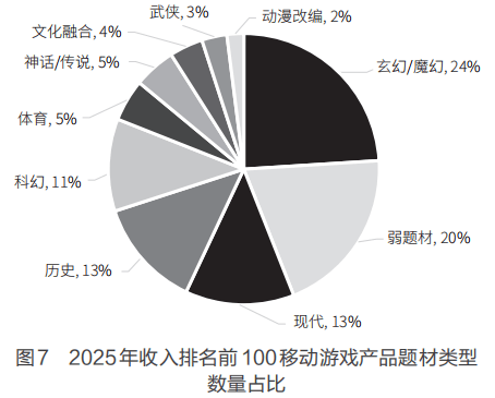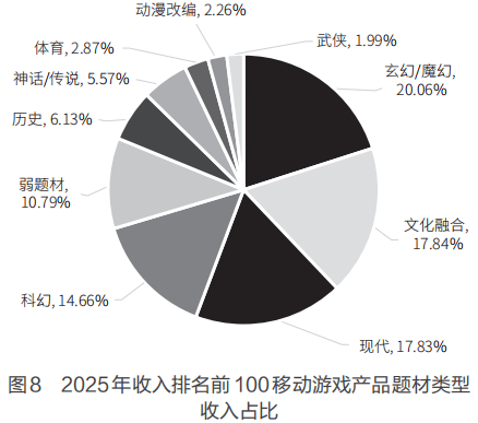 2025年,在收入排名前100的移动游戏产品中,数量占比较高的3种题材类型分别是玄幻/魔幻、弱题材和现代,跟2024年保持一致;三者占比分别为24%、20%和13%,较2024年的26%、22%和17%均有下降。如图7所示。