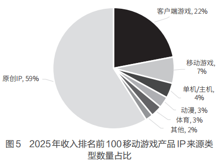 2025年,在收入排名前100的移动游戏产品中,从IP不同来源来看,数量占比最多的是原创IP,占比为59%,相比2024年占比有所上升。其次是客户端游戏IP,占比为22%。IP来自移动游戏的移动游戏产品数量占比为7%。如图5所示。
