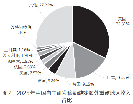 2025年,中国自主研发移动游戏海外市场实际销售收入中,美国市场占比为32.31%,日本市场占比为16.35%,韩国市场占比为9.15%,这3个国家依然是中国游戏企业“出海”的主要目标市场,合计占比达57.81%。此外,德国、英国和法国3国的市场占比合计也有8.84%。如图2所示。